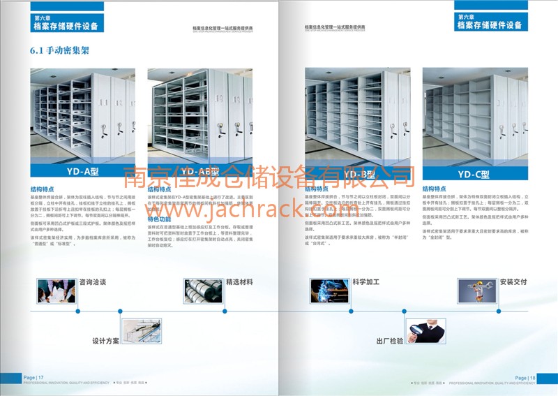 产品采用优质冷轧钢板模压成型,表面经去油--除锈--表调--磷化--清洗--钝化等十道工序加工而成。国际新流行色亚光静电喷粉,高温塑化而成,防锈蚀性能卓越,颜色由用户多种选择。架体之间的接触面配有缓冲,磁性密封条,顶部有防尘板,底部有防鼠装置。每列架体设有安全限位制动装置及防倾倒装置。边架装有锁具,用于整体锁闭。传动机构通过精加工处理,使用精密轴承,传动灵活平稳。层板间距根据需要可自由调节。